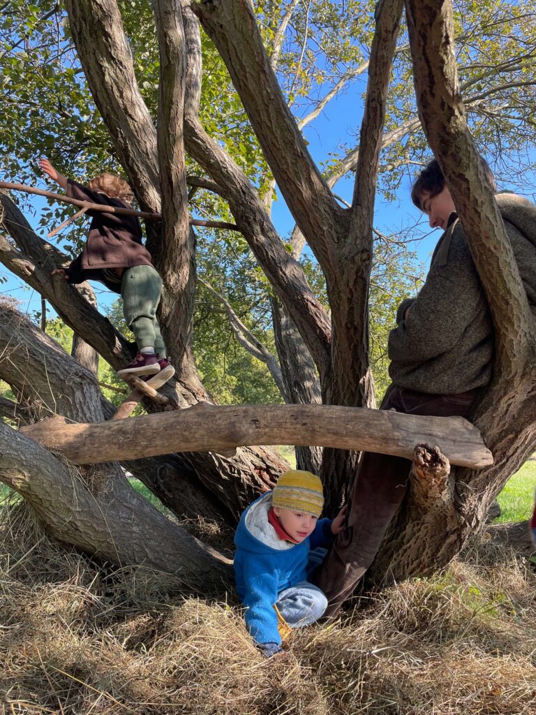 Heute war Klettertag! Auf der großen Wiese hinter dem Freibad steht ein wunderbarer Kletterbaum, auf dem die Minis ausgiebig herumgetobt sind. Dort trafen wir ein neues Kind, das einmal pro Woche zur Gruppe stößt, um bald komplett eingewöhnt zu werden. Er war direkt sehr zutraulich und kletterte sogar an meinen Händen den Baum hoch.