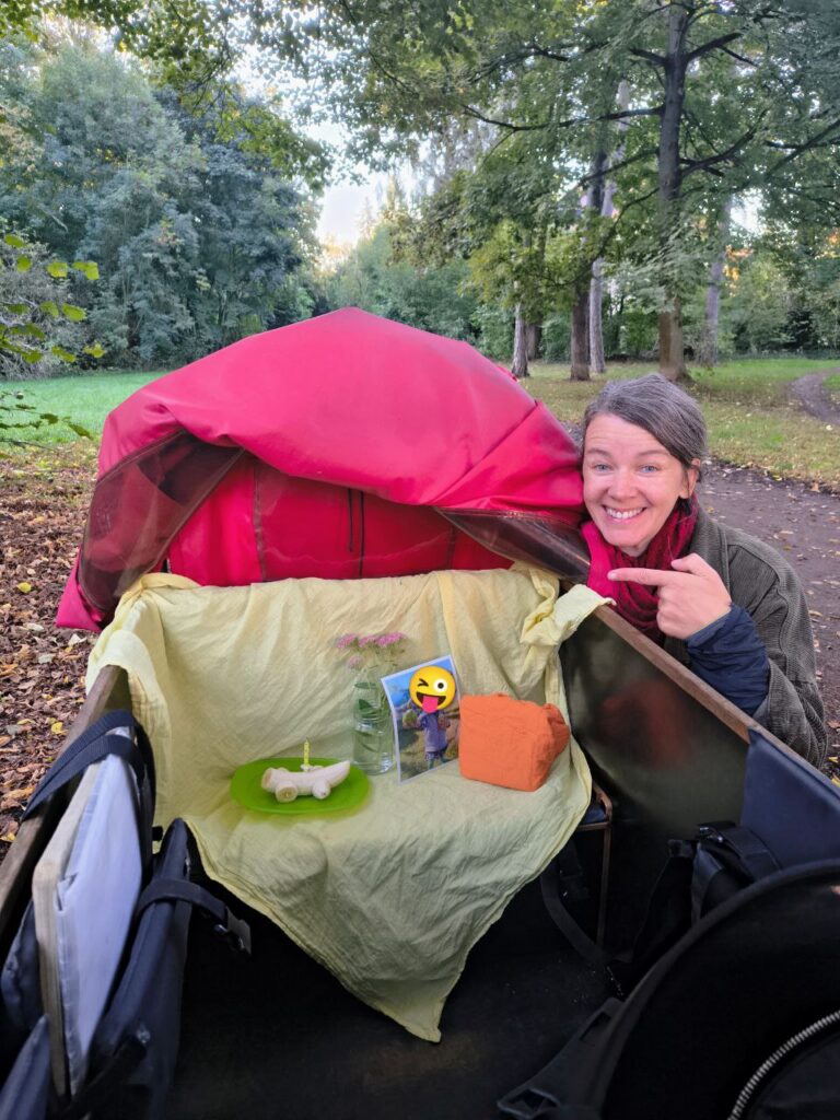 Zurück zum heutigen Tag: Wir feierten den Geburtstag einer Mini. Nancy hatte im Lastenrad einen kleinen, wunderschönen Geburtstagstisch gedeckt. Auf einem Tuch standen eine kleine Kerze, ein süßes Foto und ein Bananenauto. Sogar ein Geschenk war da: eine kleine Tasche für Pixibücher, in der schon ein Pixibuch mit Bobo Bär eingepackt war. Das sah wirklich super schön aus – da hätte ich mich auch gefreut, wäre ich ein Mini bei ihr gewesen.