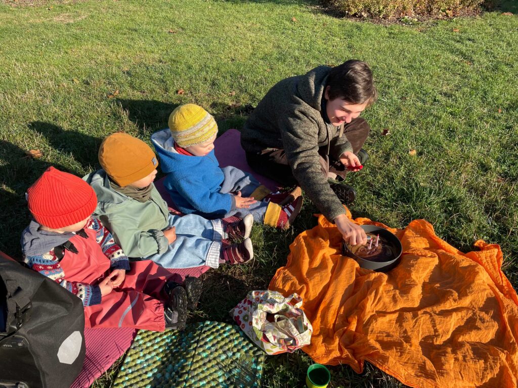 Alle drei super gelaunt, ging es zum Drei-Kastanien-Spielplatz. Den Geburtstagskuchen verspeisten wir bei einem sonnigen Picknick auf der Matte im Gras. Anschließend spielten wir noch eine große Runde auf dem modernen Spielplatz.